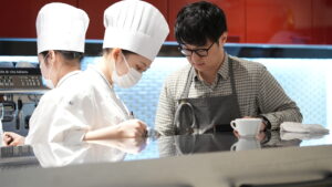 製菓の学生さんにとって、カフェの分野は少し意外に感じるかもしれません。しかし、最近はカフェを併設したケーキ屋さんも増え、カフェに興味を持つ学生さんが多くなっています。この授業を通じて、将来「エスプレッソマシンを使いこなせるようになる」「ラテアートの基本をマスターする」「カフェで働くイメージを持てるようになる」など、生徒さんたちの選択肢を広げるお手伝いができればと考えています。