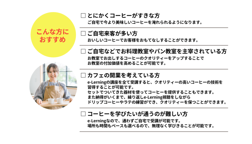 コーヒーの豆知識もお伝えしながら、器具の扱い、温度の管理、豆の管理など大切なことを盛り込み、